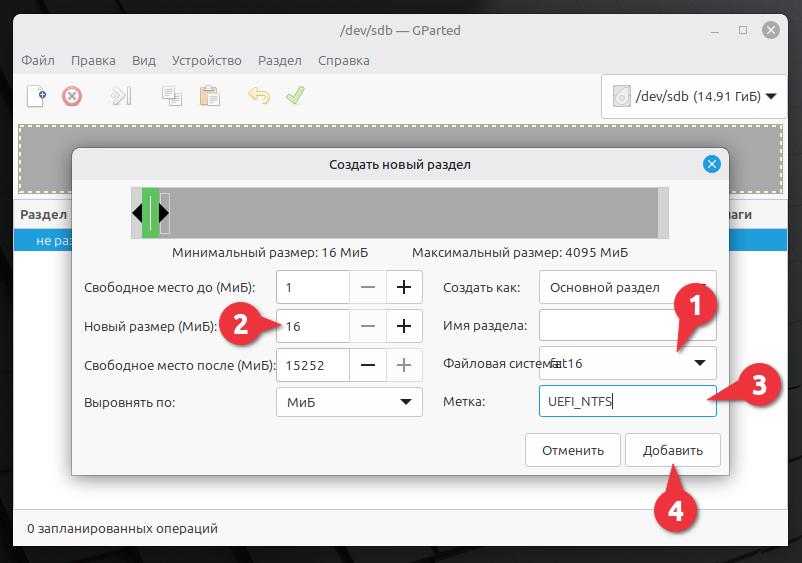 Выбираем файловую систему FAT16, задаём размер 16 MB, даём имя метки UEFI_NTFS, нажимаем Добавить.