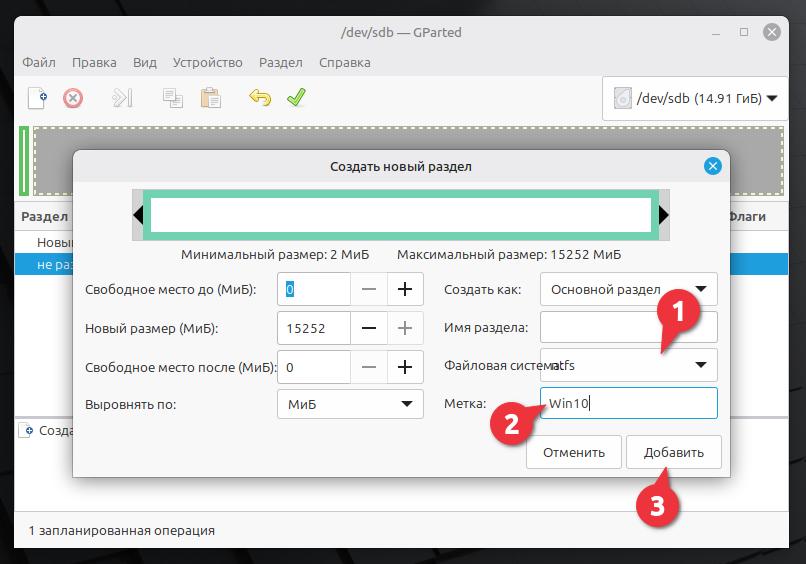 Создаём второй раздел. Выбираем файловую систему NTFS, даём имя метки Win10, нажимаем Добавить.