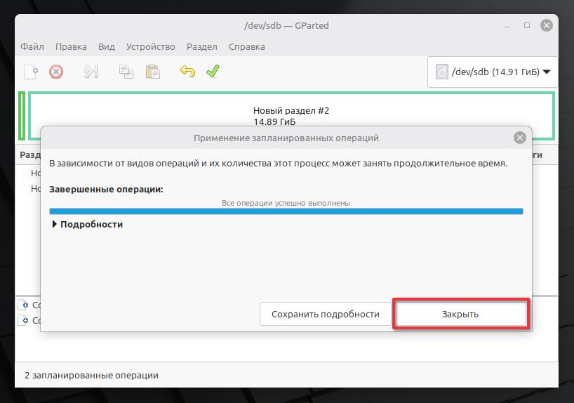 Готово! Закрываем программу GParted.