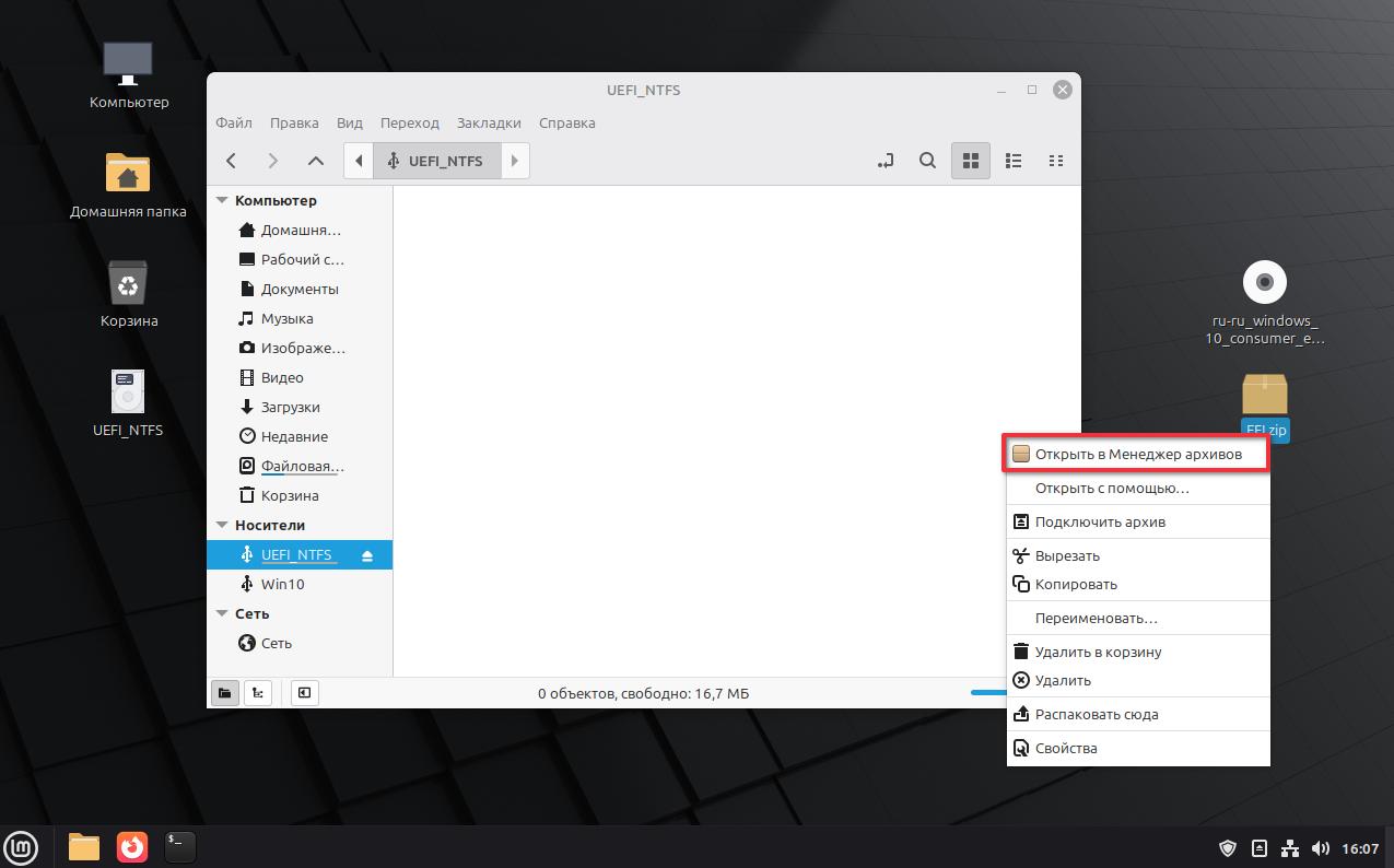 Открываем архив EFI.zip. Нажимаем правой мыши по архиву. Открыть в Менеджере архивов.
