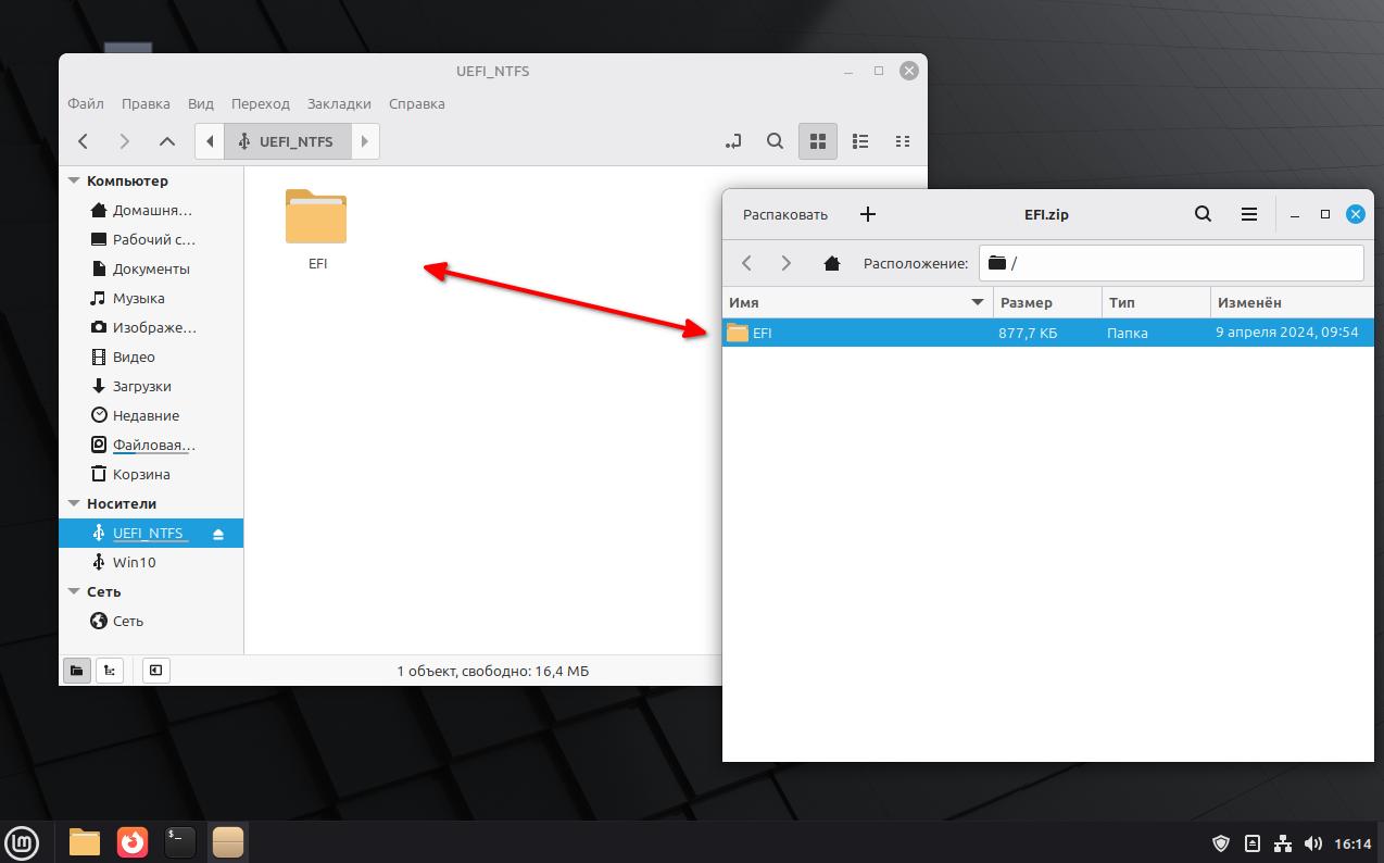 Копируем из архива папку EFI на раздел UEFI_NTFS на нашей флешке.