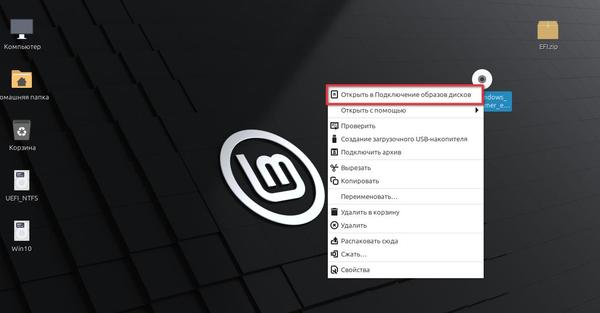 Монтируем образ Windows 10. Нажимаем правой мыши по образу. Открыть в Подключение образов дисков.