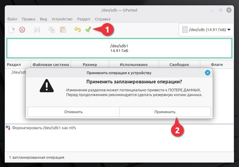 Форматируем раздел dev/sdb1 в файловую систему NTFS.