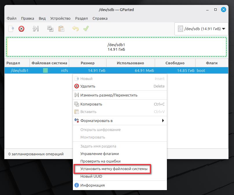 Нажимаем правой кнопкой мыши по разделу dev/sdb1. В контекстном меню выбираем Установить метку файловой системы.