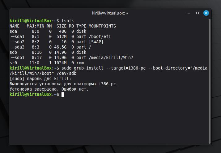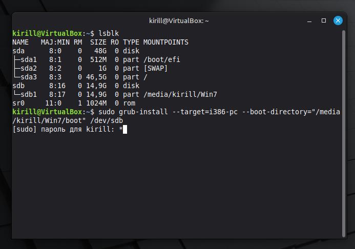 sudo grub-install --target=i386-pc --boot-directory="/media/kirill/Win7/boot" /dev/sdbВводим пароль администратора.