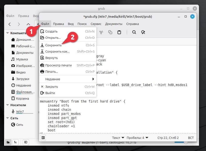 Открываем в текстовом редакторе созданный нами файл grub.cfg. Вставляем следующий текст.