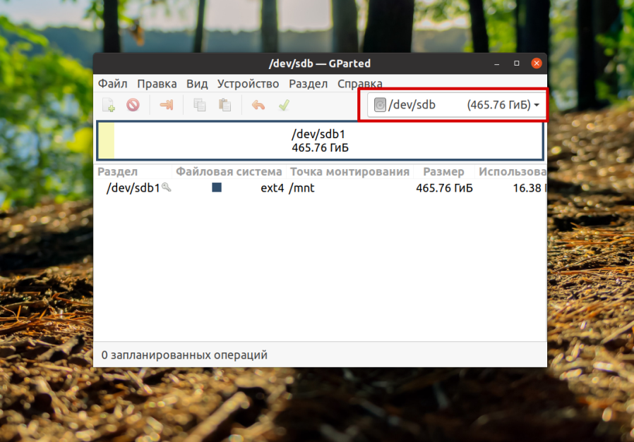 Далее в правом верхнем углу программы выберите диск, на котором вы хотите удалить раздел. В данном случае будет использоваться /dev/sdb: