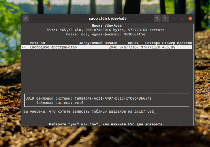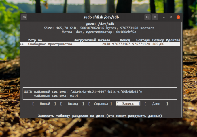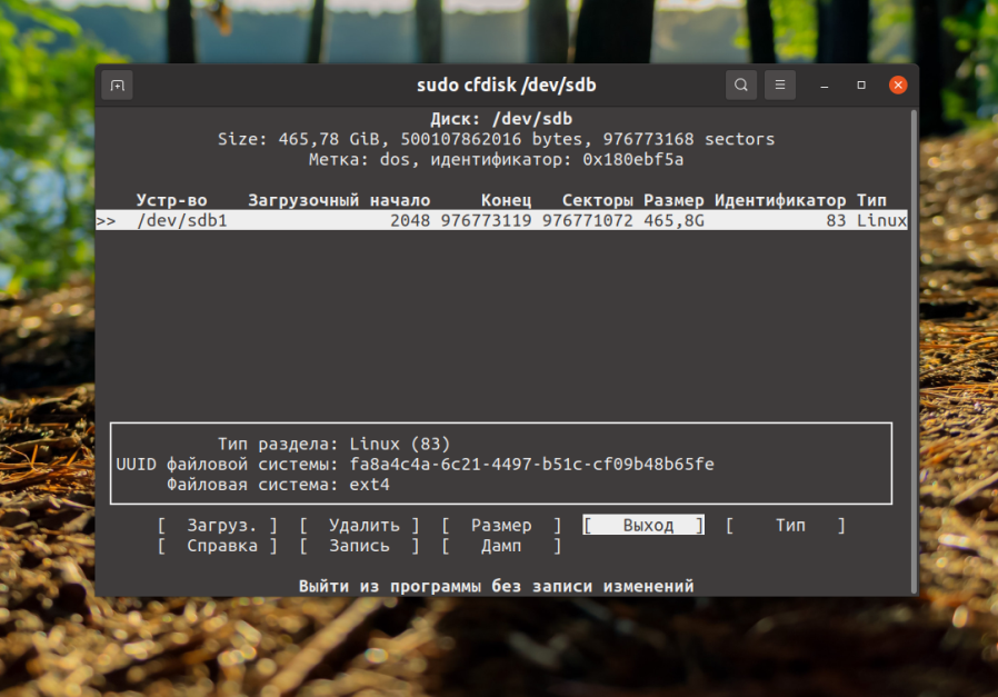 Теперь вы можете использовать полученное свободное пространство. Для того чтобы закрыть программу используйте кнопку Выход. Благодаря cfdisk удалить разделы жесткого диска linux в терминале не так уже и сложно.