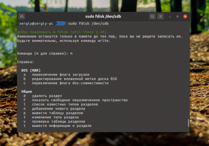 Если два предыдущих варианта вам не подходят, можете воспользоваться утилитой fdisk. У неё нет никакого интерфейса и вам придется делать всё вручную. Сначала посмотрите список дисков: