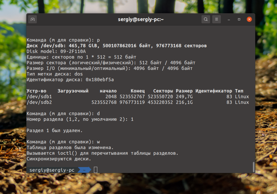 Все изменения выполнены только в памяти программы. Для того чтобы записать их на диск и удалить разделы fdisk linux необходимо использовать команду w:
