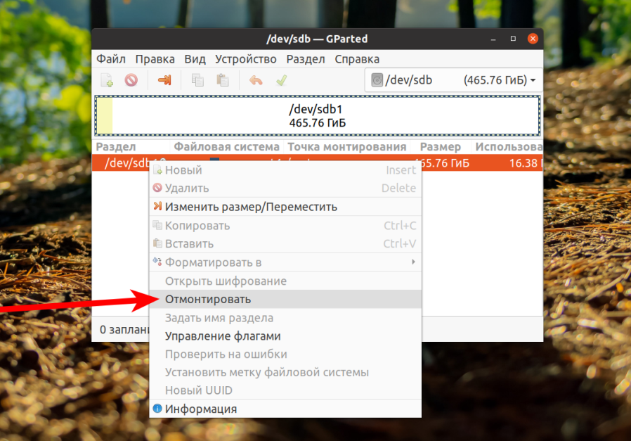 Если раздел сейчас смонтирован в системе, то удалить его вы не сможете. На это указывает ключ возле диска. Сначала необходимо его размонтировать. Для этого откройте контекстное меню и выберите Отмонтировать: