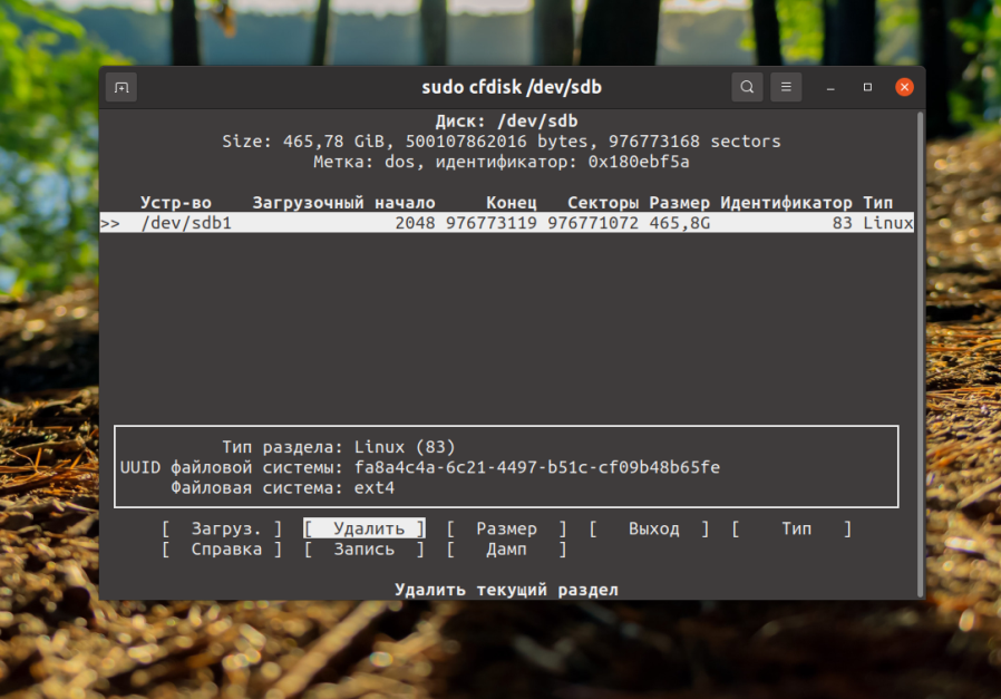 Если вам нужно удалить раздел Linux в терминале, но у вас нет доступа к графическому интерфейсу и вы не хотите пользоваться утилитами командной строки, можно воспользоваться утилитой с псевдографическим интерфейсом — cfdisk. Если она ещё не установлена в вашей системе её можно установить так: