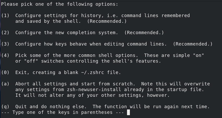Чтобы начать использовать его, просто запустите zsh, и новая оболочка предложит вам мастер начальной настройки для новых пользователей, как показано на скриншоте ниже.