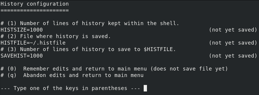 Например, введите (1), чтобы выбрать настройки параметров для history.