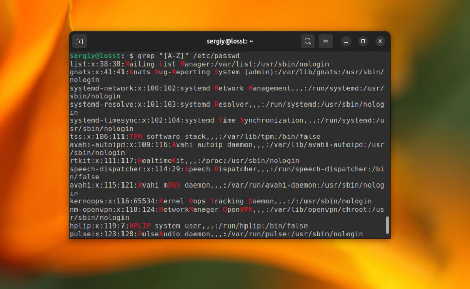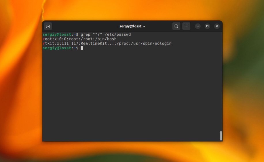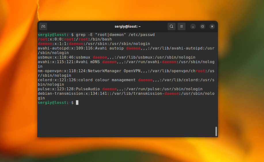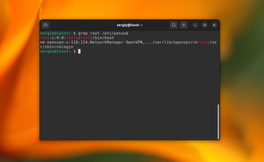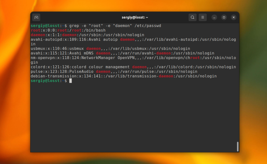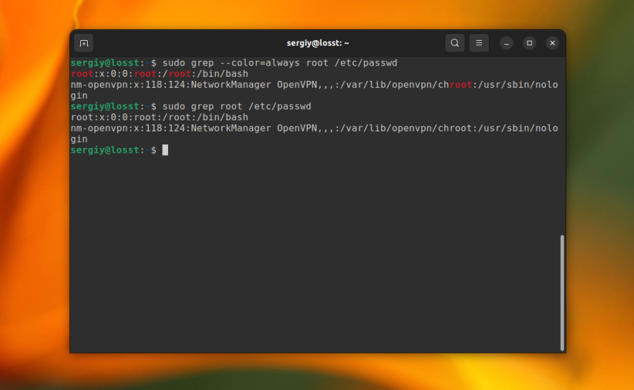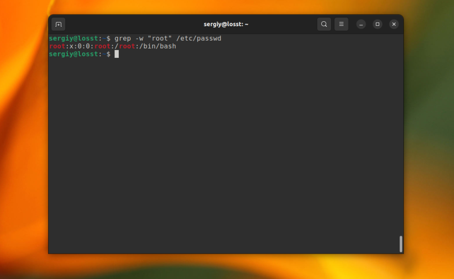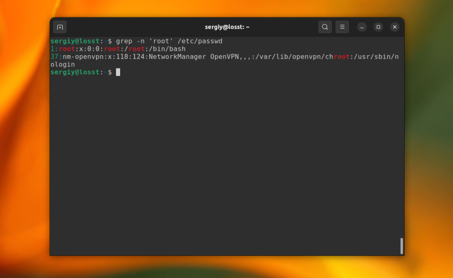 В первом примере мы будем искать информацию о пользователе root в файле со списком пользователей Linux /etc/passwd. Для этого выполните следующую команду: