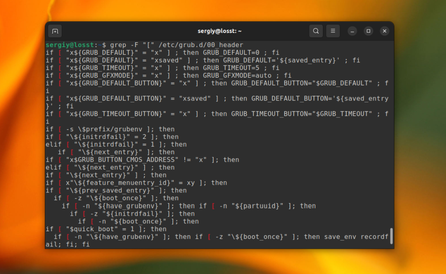Это всё хорошо работает пока ваш поисковый запрос не содержит специальных символов. Например, если вы попытаетесь найти все строки, которые содержат символ «[» в файле /etc/grub/00_header, то получите ошибку, что это регулярное выражение не верно. Для того чтобы этого избежать, нужно явно указать, что вы хотите искать строку с помощью опции -F:
