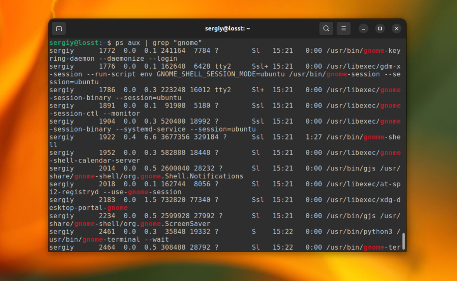 Для того чтобы отфильтровать вывод другой команды с помощью grep достаточно перенаправить его используя оператор |. А файл для самого grep указывать не надо. Например, для того чтобы найти все процессы gnome можно использовать такую команду: