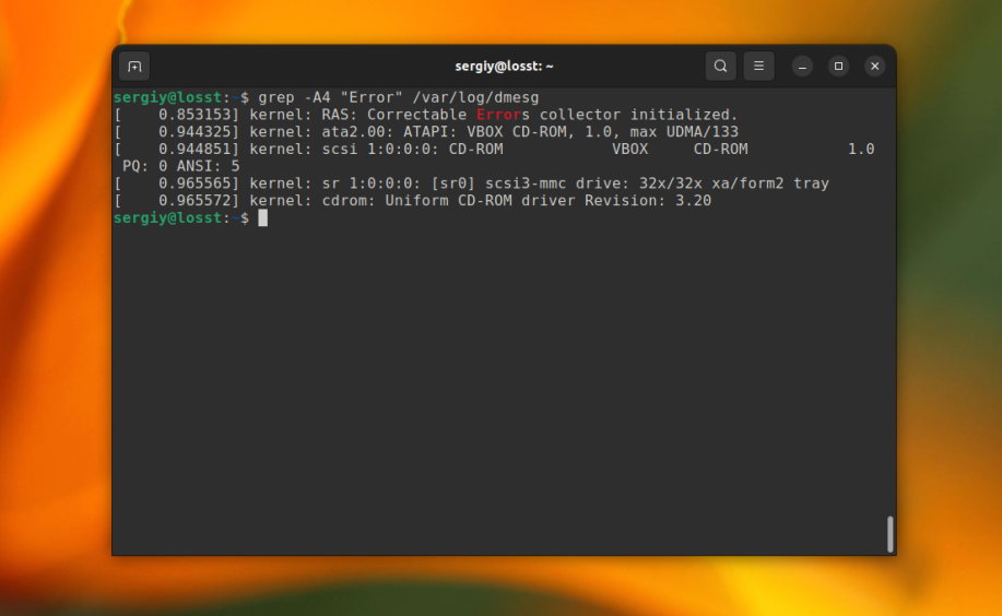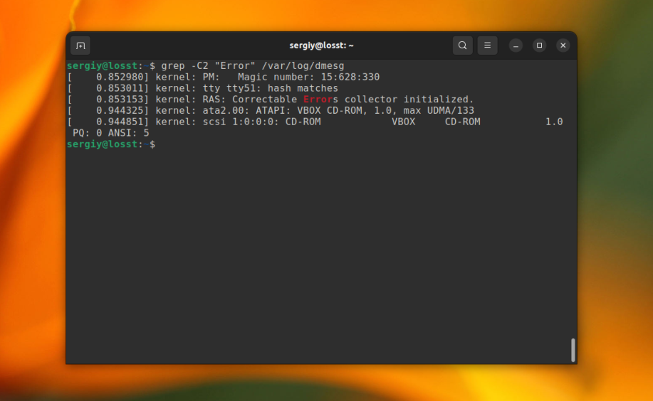 Иногда бывает очень полезно вывести не только саму строку со вхождением, но и строки до и после неё. Например, мы хотим выбрать все ошибки из лог-файла, но знаем, что в следующей строчке после ошибки может содержаться полезная информация, тогда с помощью grep отобразим несколько строк. Ошибки будем искать в /var/log/dmesg по шаблону «Error»:
