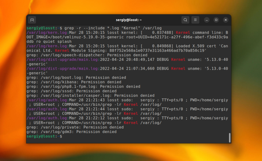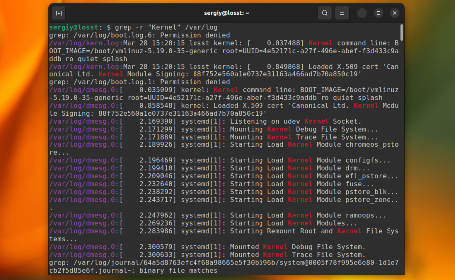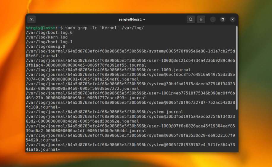 До этого мы рассматривали поиск в определённом файле или выводе команд. Но grep также может выполнить поиск текста в нескольких файлах, размещённых в одном каталоге или подкаталогах. Для этого нужно использовать опцию -r. Например, давайте найдём все файлы, которые содержат строку Kernel в папке /var/log: