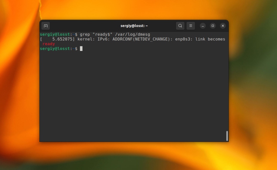 А так можно найти все строки, которые заканчиваются на ready в файле /var/log/dmesg: