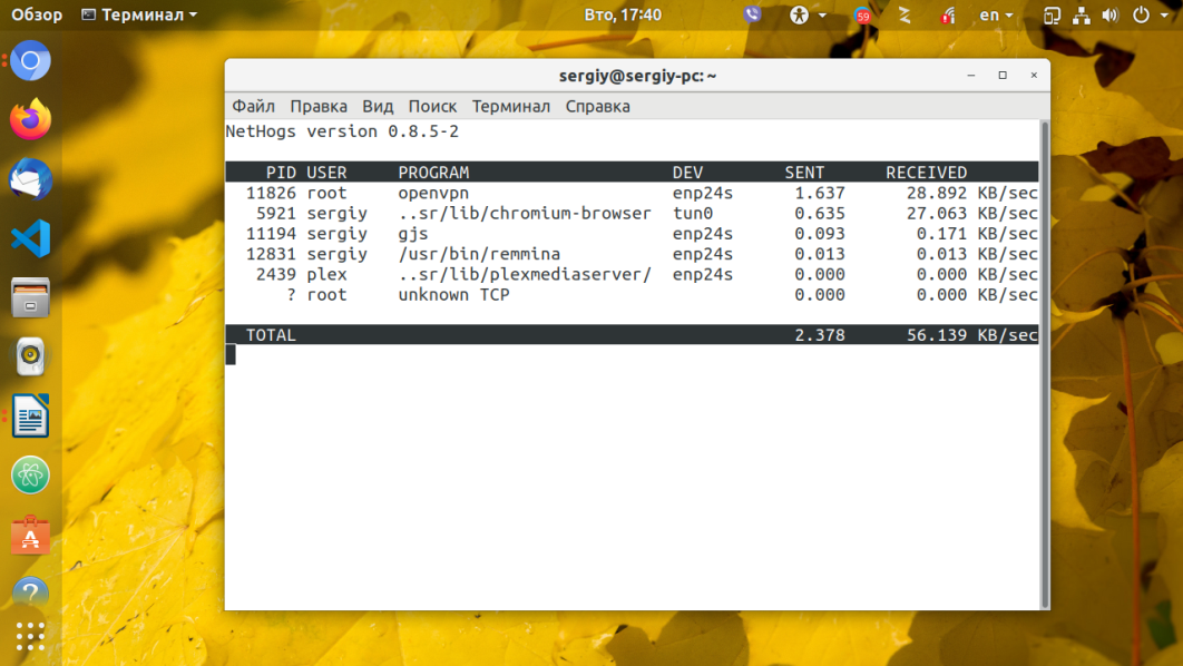 Как вы видите программа показывает такие детали как PID, пользователя, сетевой интерфейс, количество данных и скорость передачи или приема.