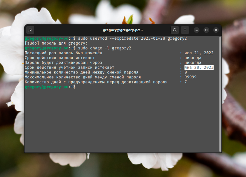 А еще с помощью —expiredate можно указать точную дату для блокировки в формате ГГГГ-ММ-ДД. Вот как будет выглядеть команда для 28 января 2023 года: