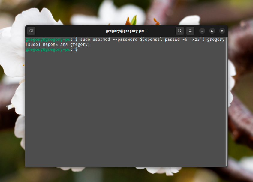 sudo usermod --password $(openssl passwd -6 'xz3') gregory