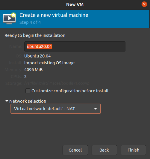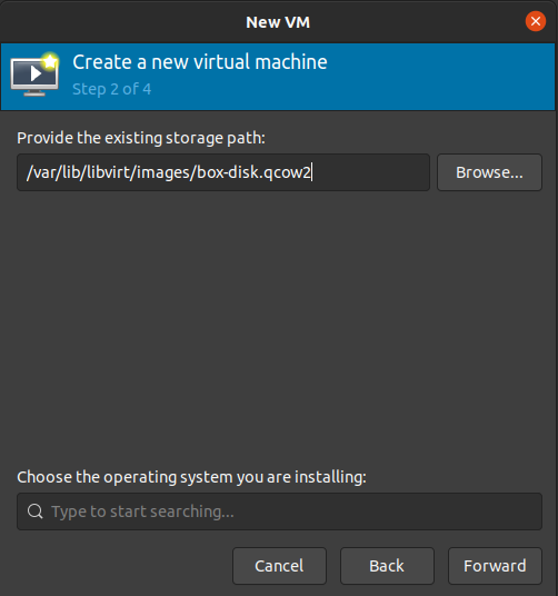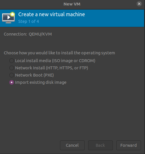 $ mv box-disk1.qcow2 /var/lib/libvirt/images/Теперь в Virtual Machine Manager создадим новую машину, выбрав импорт существующего образа.