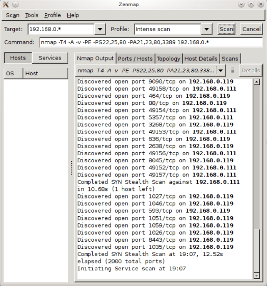 Когда место назначения установлено и профиль сканирования выбран, следует нажать «Сканировать» и заняться своими делами (а может и нет, все будет зависеть от объёма данной задачи nmap и быстроты сети). Как только сканирование завершится, список хостов, которые были найдены, отобразится на левой панели.