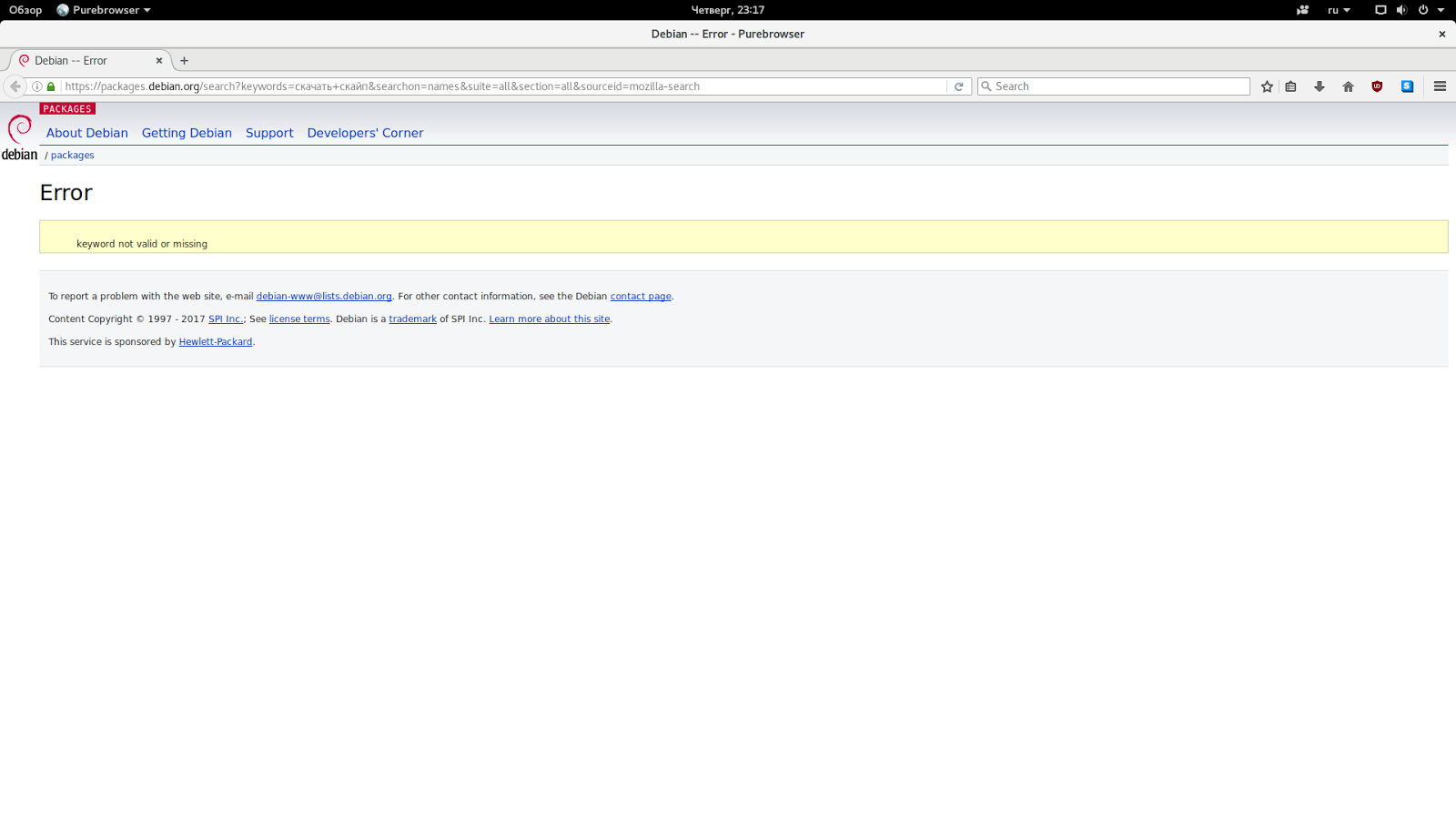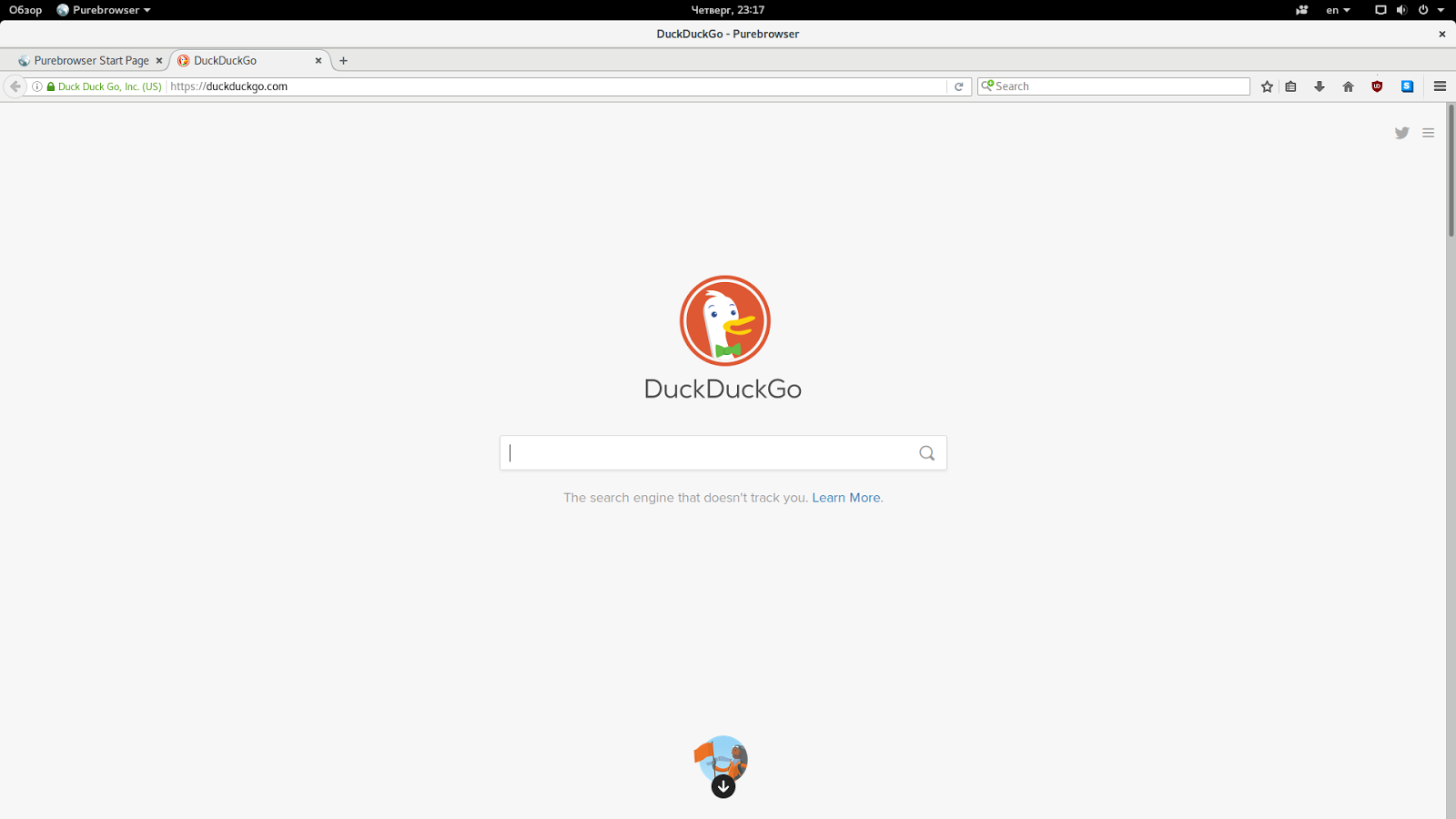 Перейдём к набору приложений. Браузером по-умолчанию является Purebrowser — сборка на основе Firefox, в которую также входят компоненты Tor Browser, расширения uBlock Origin и HTTPS Everywhere, а в качестве поискового движка используется DuckDuckGo, которые не отслеживает переходы по ссылкам. Параноидальнее браузер ещё надо поискать 🙂 Проблем в его работе замечено не было. Видео работает, соцсети грузятся, на Rutracker заходит. Правда вот за основу взят Firefox 45, а сейчас, напомню, уже есть Firefox 57. Другой момент — по умолчанию, не пойми зачем, задействован поиск среди пакетов Debian….Хотели что-то поискать в интернете — а вас перекидывает на сайт Дэбиановских репозиториев и пишет, что пакет «скачать скайп» не найден. Приходится лезть в настройки.