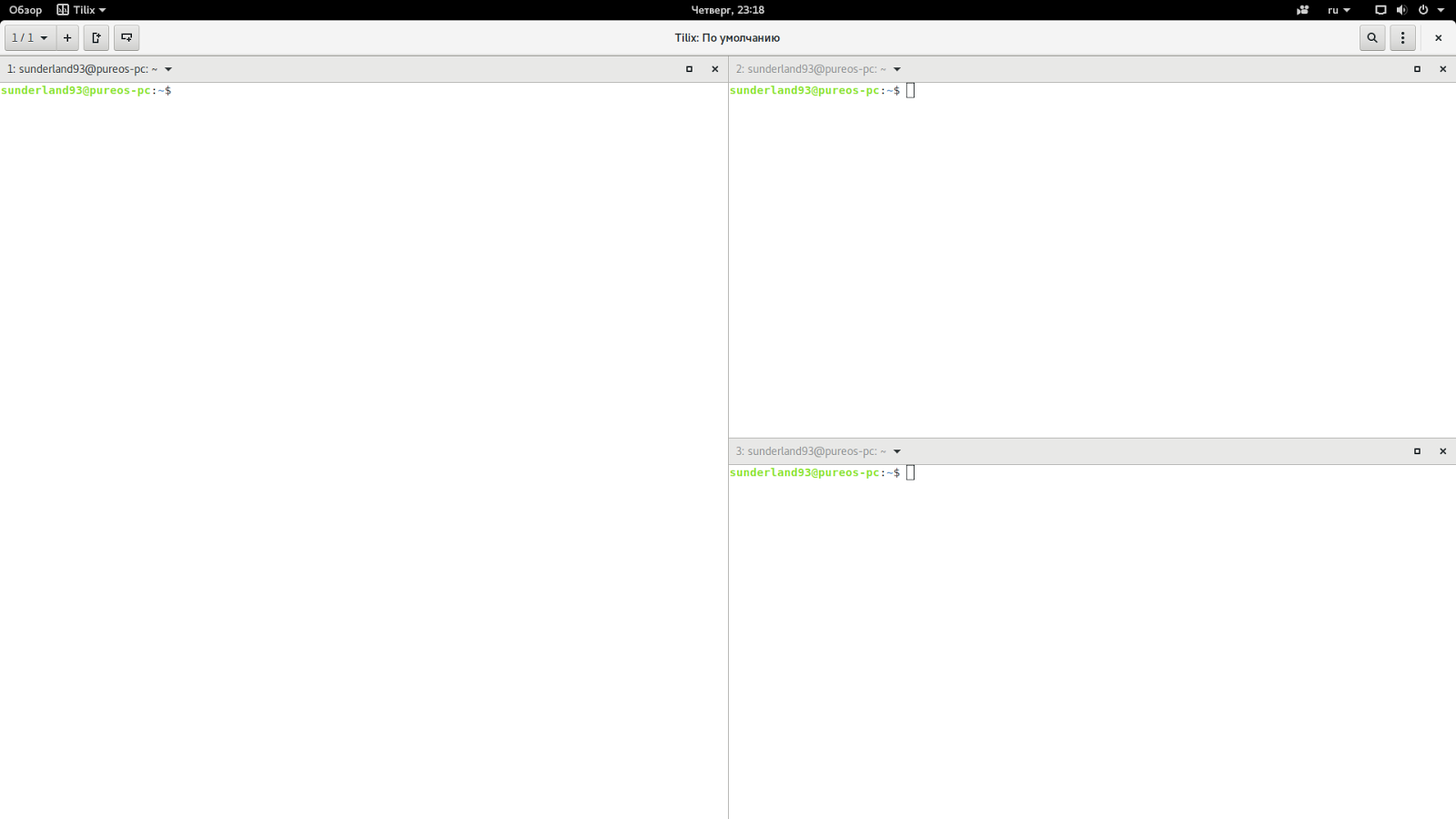 В качестве эмулятора терминала задействован Tilix (ранее назывался Terminix). Говоря простым языком — это GNOME Terminal со встроенным tmux 🙂 Позволяет открывать несколько терминальных сессий в одном окне, удобно их располагая.