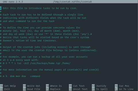 Каждая строка в пользовательском файле crontab содержит шесть полей, разделенных пробелом, за которым следует команда, которую нужно запустить.