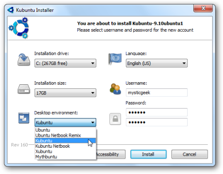 Если у вас еще нет компакт-диска с Ubuntu, можно также загрузить установщик Wubi и начать процесс установки. Это еще больше упрощает процесс, поскольку вам не нужно загружать ISO-образ и записывать его на диск. Одна вещь, на которую следует обратить внимание при использовании этого метода, – вы получите дополнительные возможности выбора типа среды рабочего стола, которую вы хотите установить. В этом примере мы выбираем среду Kubuntu.