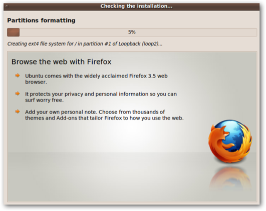При первой загрузке в Ubuntu подождите несколько минут, пока установка завершится. Вы увидите серию экранов, а затем отобразится главный экран установки, показывающий прогресс, и экраны, показывающие функции, предлагаемые в Ubuntu 9.10.