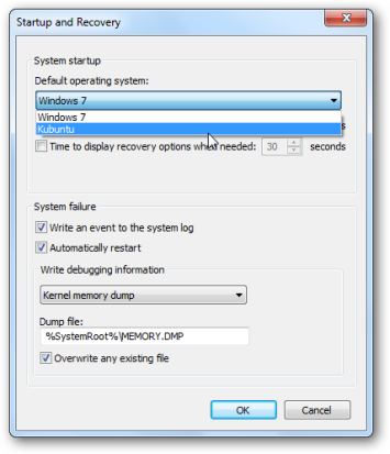 После того, как Ubuntu будет полностью установлен, вы можете выбрать загрузочную систему по умолчанию, перейдя в Advance System Settings Startup and Recovery … и выбрав Windows или Ubuntu. Чтобы узнать больше о настройке этого параметра, ознакомьтесь со статьей Geek: «Простая настройка ОС по умолчанию в установке двойной загрузки Windows7/Vista».