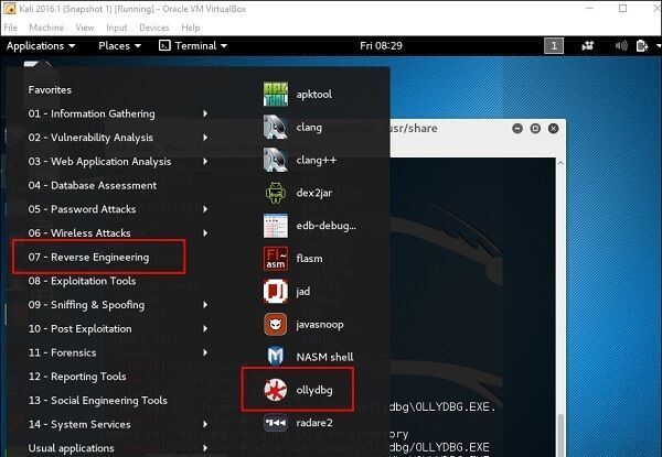 Чтобы открыть пройдите в меню Applications → Reverse Engineering → ollydbg