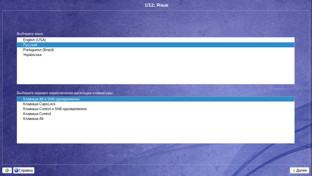 Далее необходимо выбрать язык системы из предложенного списка и сочетание клавиш для переключения раскладки клавиатуры: