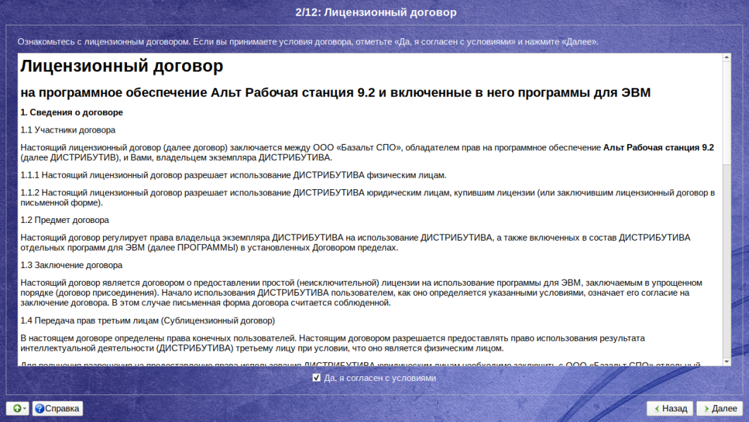В данном пункте необходимо принять лицензионное соглашение поставив галочку напротив пункта Да, я согласен с условиями: