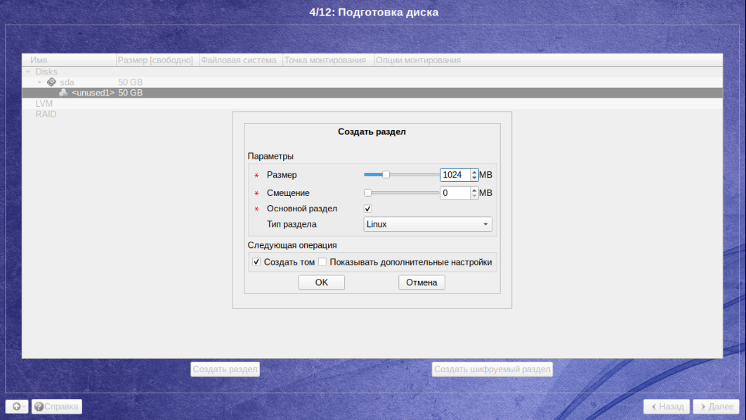 Для начала необходимо создать раздел для загрузки системы. Для этого в появившемся окне нажмите на кнопку Создать раздел которая находится ниже и далее в появившемся окне вводим размер раздела (для раздела boot будет достаточно 1ГБ, вводим 1024 так как объём представлен в Мегабайтах). Убедитесь, что стоят галочки напротив пунктов Создать том и Показывать дополнительные настройки. Нажмите на кнопку ОК: