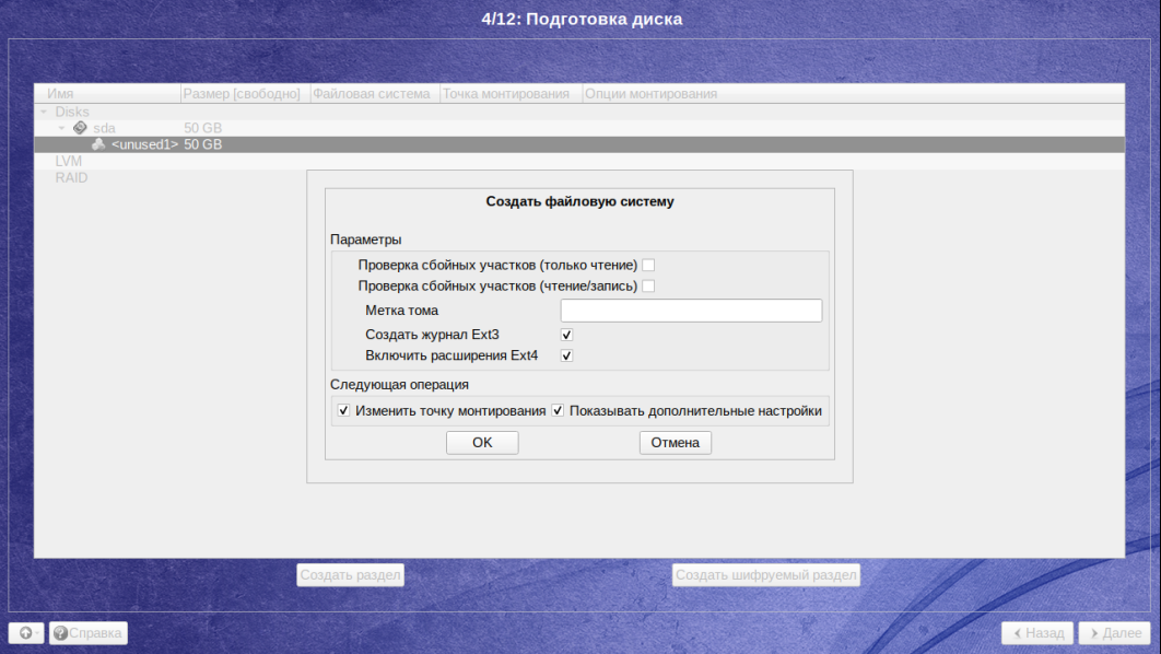 В следующем окне выберите тип файловой системы Файловая система Ext2/3/4: