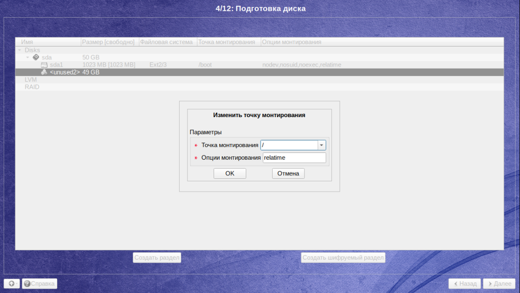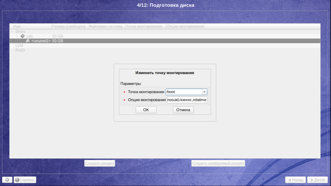 На последнем этапе в разделе Точка монтирования необходимо выбрать /boot: