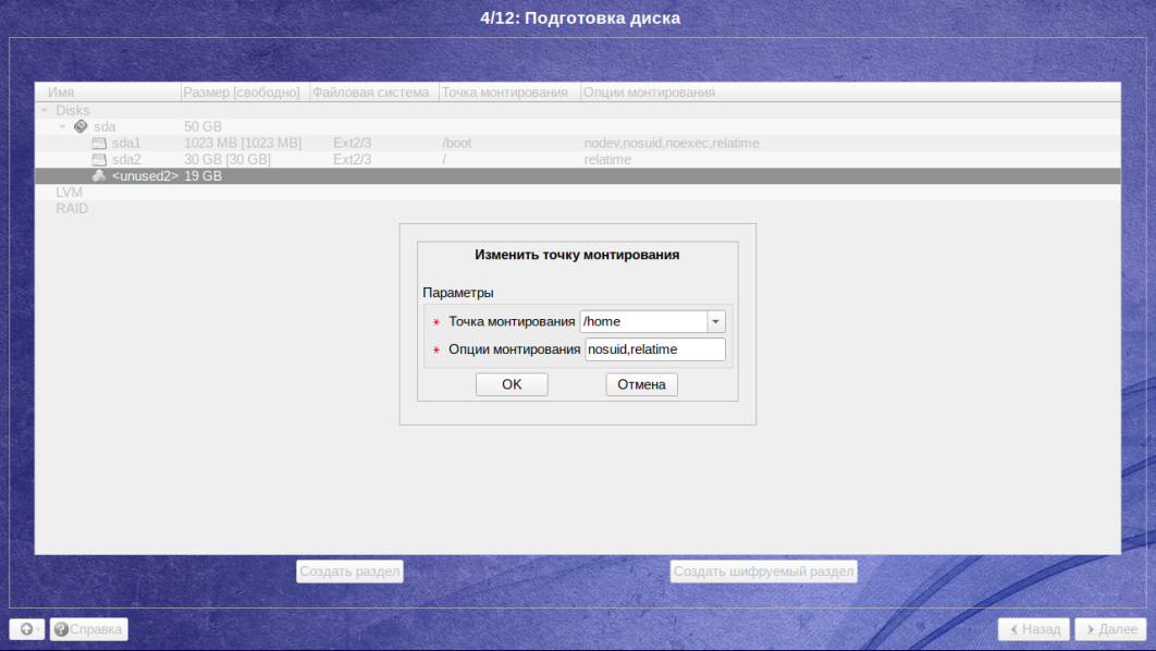 Домашний раздел создается аналогичным способом, описанным выше. Для домашнего раздела можно использовать оставшееся место на диске или указать желаемый объём. В данном случае будет выделено оставшиеся 19 ГБ. В качестве точки монтирования необходимо выбрать /home: