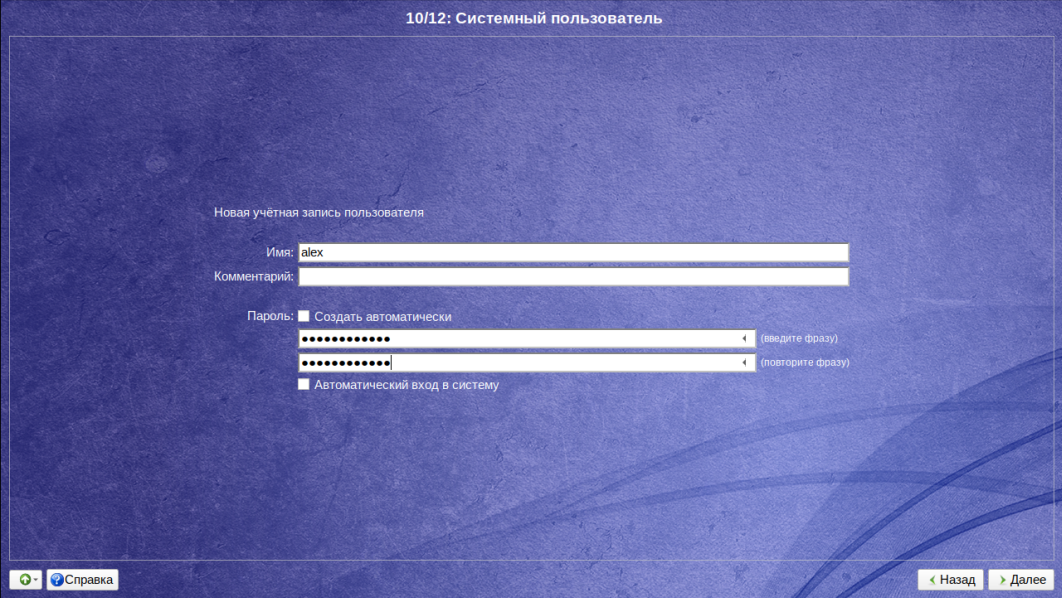 Следующий шаг — установка загрузчика GRUB. Для этого выберите необходимый диск и задайте пароль при желании. Нажмите на кнопку Далее для продолжения: