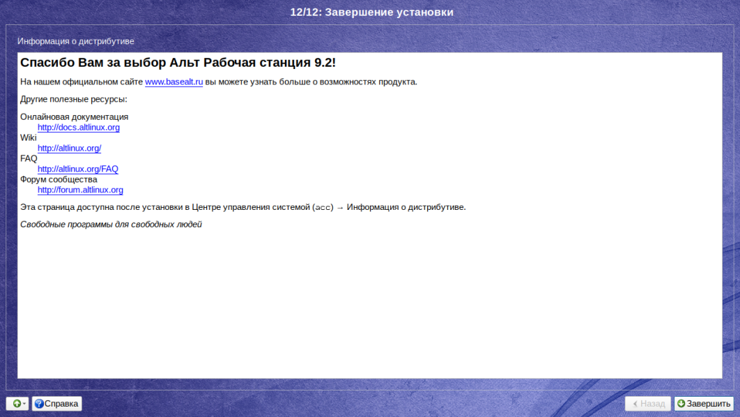В качестве завершения установки система отображает ссылки на страницы поддержки и документацию. Для завершения установки необходимо нажать на кнопку Завершить: