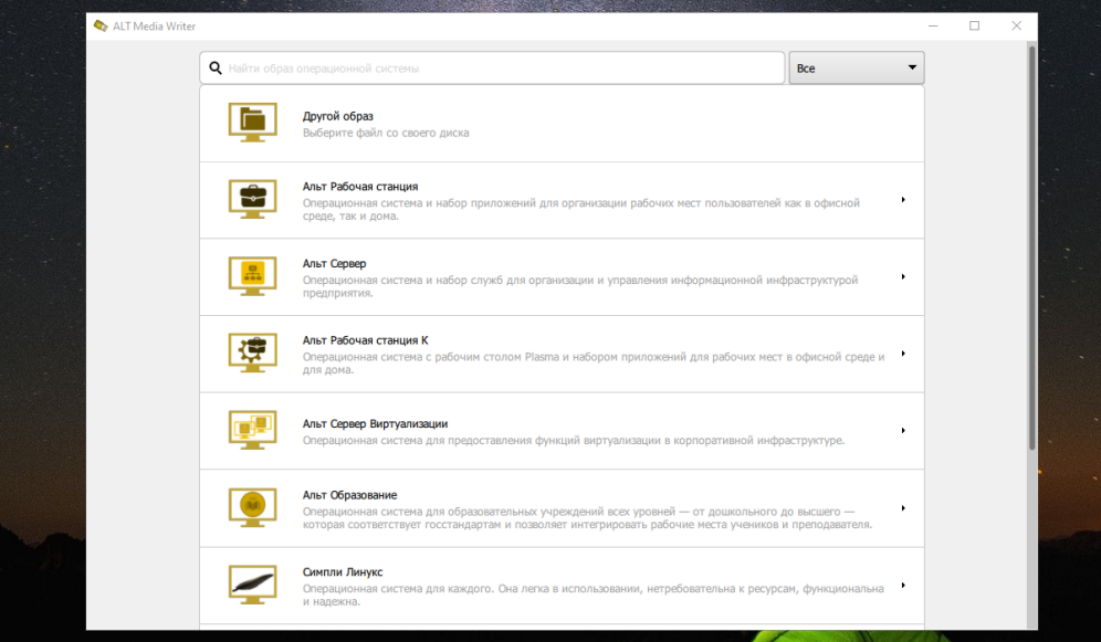 Или же можно воспользоваться официальной программой ALT Media Writer которая скачает образ операционной системы и создаст установочную флешку. Скачайте и установите программу. Скачать программу можно по ссылке.