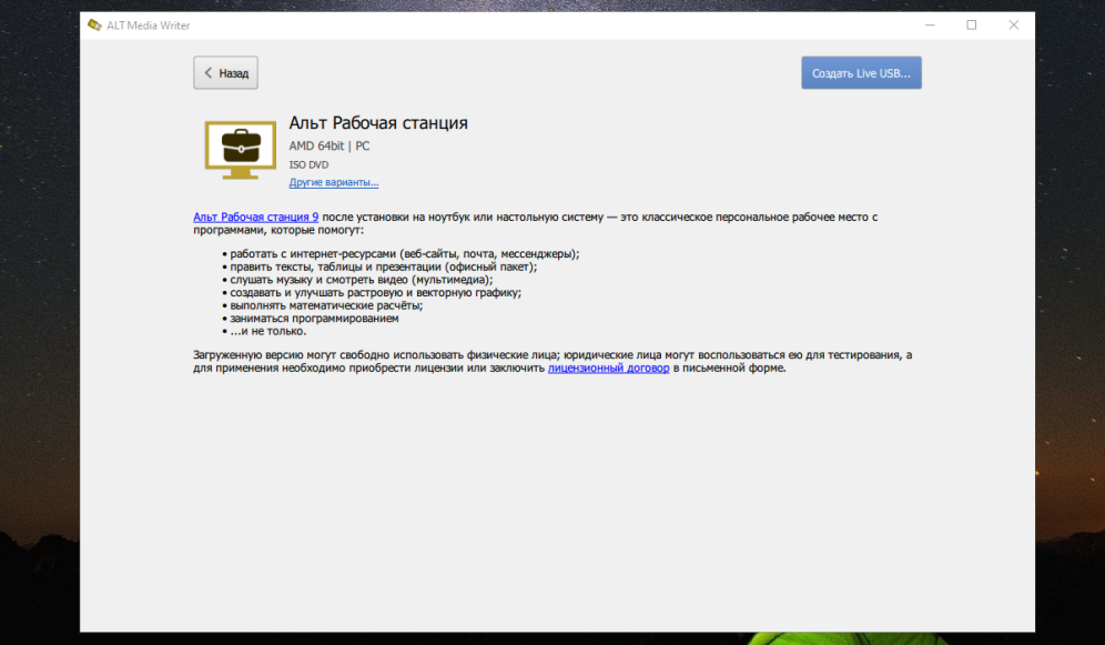 В данном примере будет выбрана редакция Альт Рабочая станция. Перейдите в раздел и нажмите на синюю кнопку Создать Live USB: