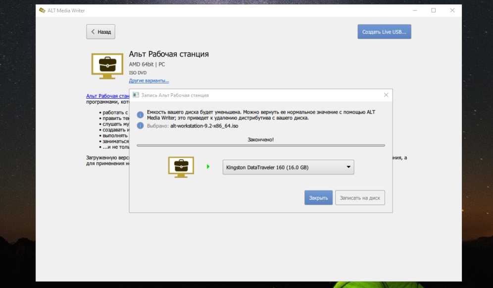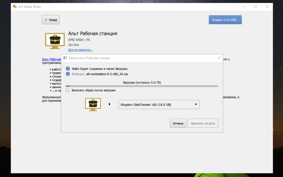 Что касается записи на оптический диск, то в официальной документации ALT Linux написано, что такие программы как UNetbootin и UltraISO могут повредить носитель (подробнее об этом см. в официальной документации по записи образа).