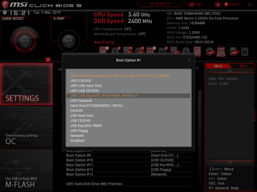 В системах с UEFI алгоритм действий примерно такой же. Необходимо найти меню Boot или Загрузка и установить там на первое место вашу флешку. Например, в материнских платах MSI нужно открыть Settings, затем Загрузка и в пункте Boot Option #1 выбрать вашу флешку: