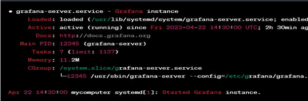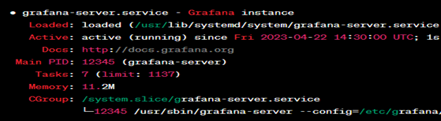 Эти выходные данные показывают, что служба grafana-server активна и работает с идентификатором процесса 12345. Служба была запущена 2 часа 30 минут назад, как указано в строке «Активно». Вывод также показывает аргументы командной строки, которые используются для запуска процесса grafana-server.