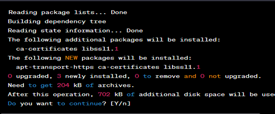 В этом образце выходных данных система проверяет наличие доступных пакетов и зависимостей, необходимых для установки apt-transport-https. Затем вам будет предложено подтвердить продолжение установки, отобразив сообщение «Do you want to continue? [Y/n]». Вы можете продолжить, введя «Y», чтобы загрузить и установить необходимые пакеты.